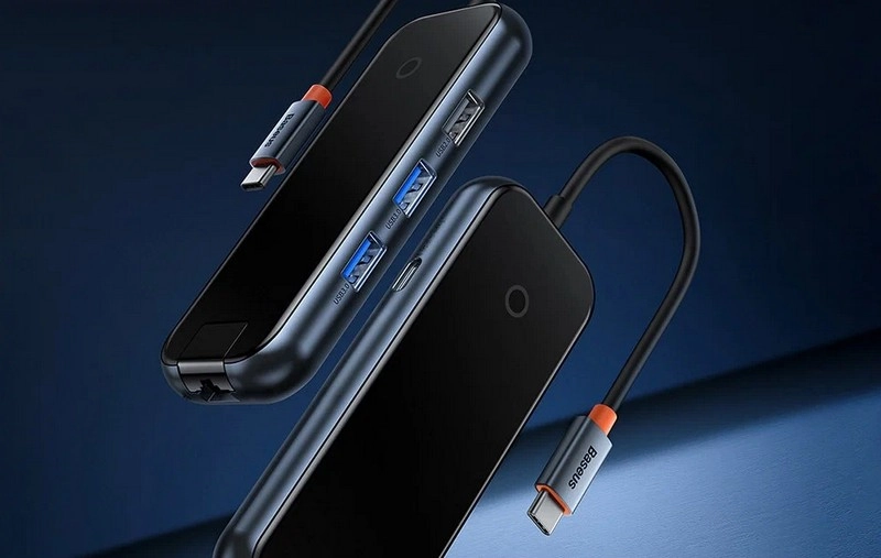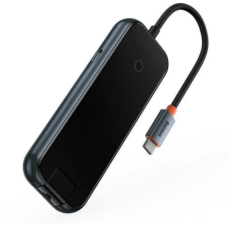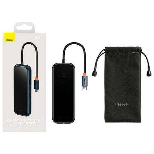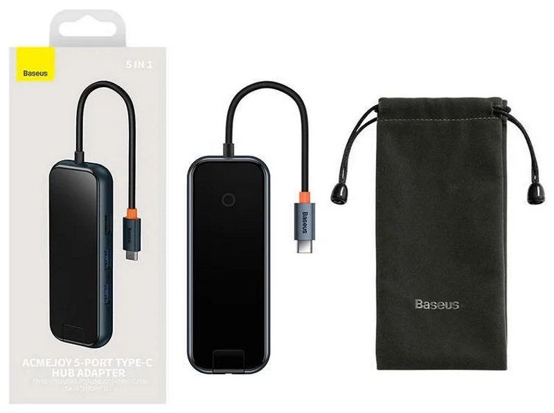 Адаптер-Хаб Baseus ACMEJOY 5-Port Type-C Hub Adapter (Type-C to USB 3.0*2+USB 2.0*1+Type-C PD&Data*1+RJ45*1) WKJZ010113 — расширяет возможности вашего ноутбука, добавляя ему новые высокоскоростные порты. Хаб поддерживает быструю зарядку мощностью до 100 Вт и скорость передачи данных до 5 Гбит/с. Разъем RJ45 с поддержкой до 1000 Мбит/с позволяет подключить к устройству проводной интернет или создать локальную сеть.