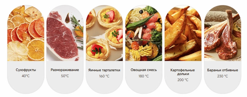 Прибор поддерживает нагрев от 40 до 230 C: низкие режимы подходят для разморозки, сушки фруктов или ферментации, а высокие — для запекания, жарки и гриля. Такая гибкость превращает аэрогриль в универсальный кухонный инструмент.