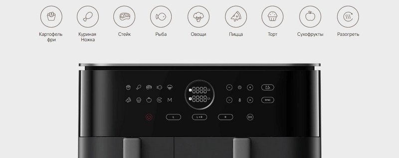 Кнопка L+R позволяет синхронизировать температуру и время в обеих корзинах, что удобно для приготовления одинаковых продуктов. Это упрощает процесс и делает его интуитивно понятным.