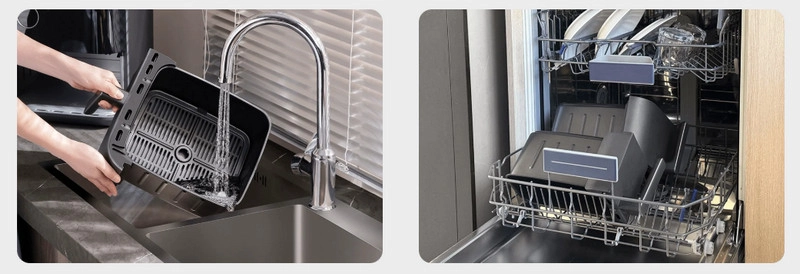 Антипригарное покрытие пищевого класса предотвращает прилипание продуктов, а корзины и аксессуары можно мыть в посудомоечной машине. Уход за прибором занимает минимум времени и усилий.