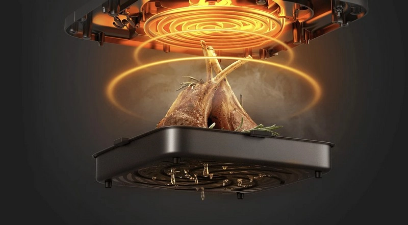 Уменьшает количество жира в еде на 39,22%, а по сравнению с обычными фритюрницами эта цифра ниже на 88,3%. Аэрогриль может создавать хрустящую корочку без добавления масла.