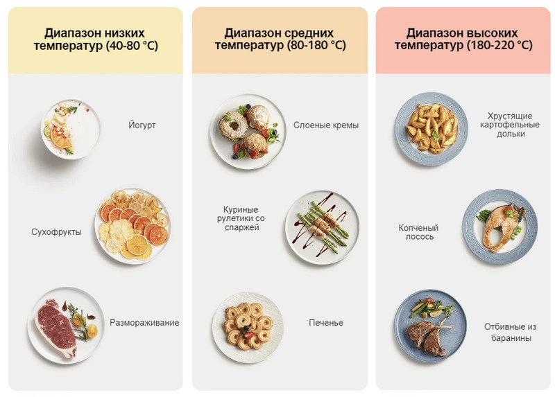 Воздушная обжарка, выпечка, йогурт, сухофрукты, размораживание, ферментация.