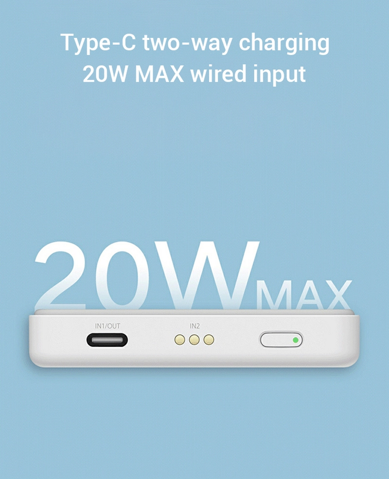 Помимо беспроводной зарядки пауэрбанк поддерживает и проводную зарядку мощностью 20 Вт.