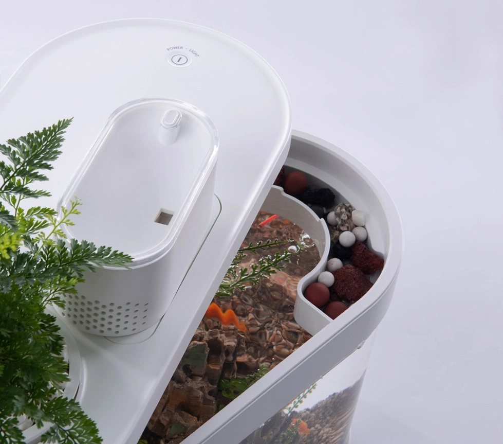 Корпус умного аквариума выполнен из прозрачного и прочного акрила единым элементом без каких-либо швов и стыков, благодаря чему он открывает огромные возможности для наблюдения за рыбками без искажений. Его овальная форма позволяет поставить аквариум в любом месте и даже встраивать его в большие интерьерные композиции.