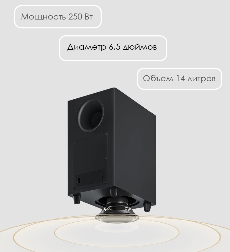 Беспроводной сабвуфер с диаметром динамика 6,5 дюймов и звуковой камерой объемом 14 литров. Его впечатляющая мощность 250 Вт передает максимальную глубину звука.