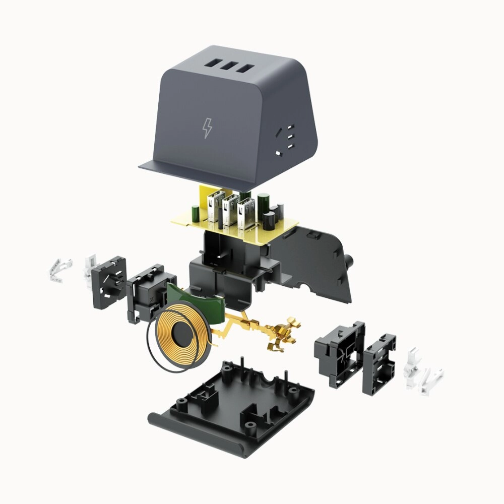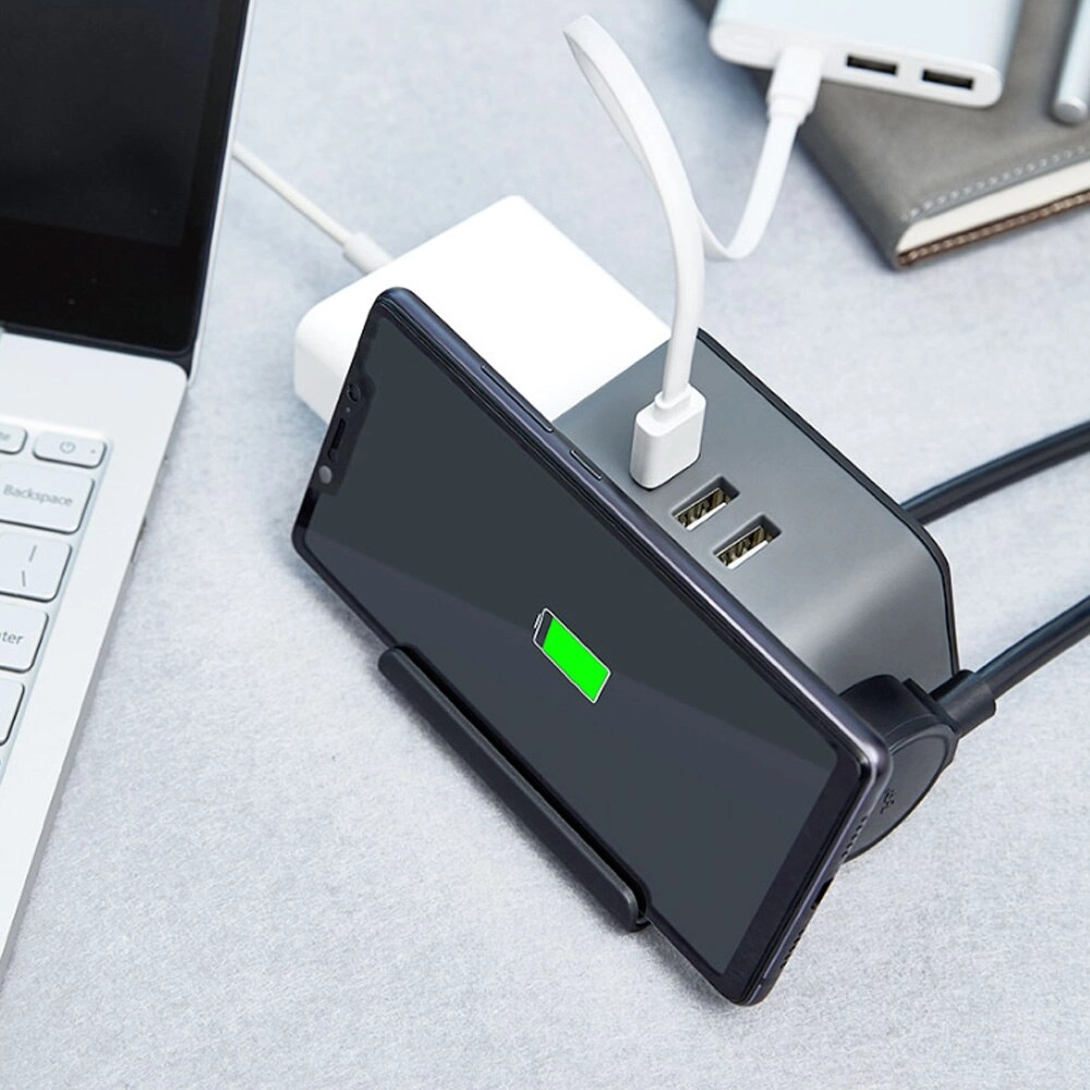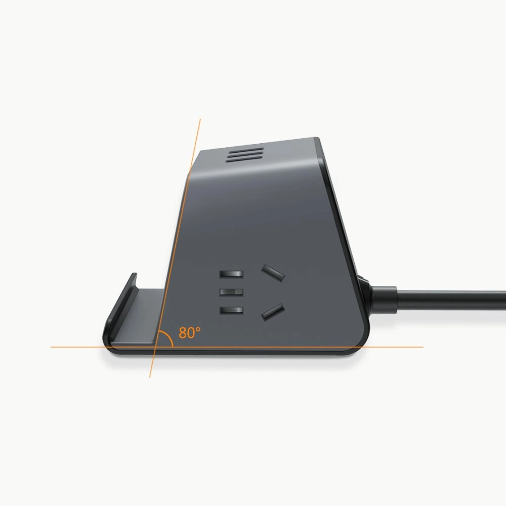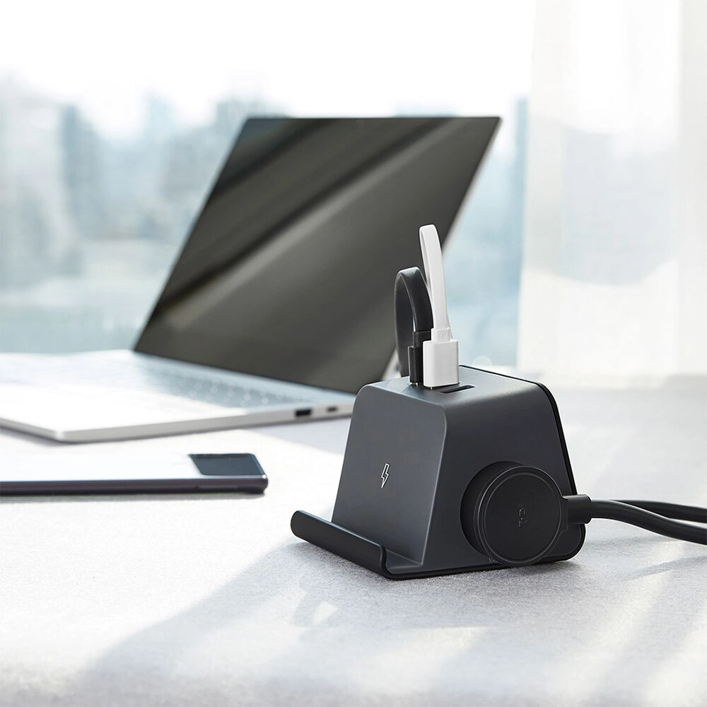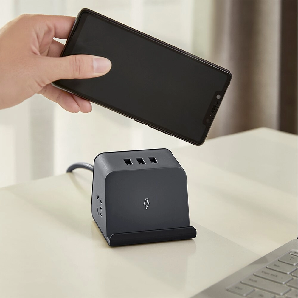 Смартфон можно разместить на подставке с беспроводной зарядкой, системный блок и монитор компьютера можно подключить к боковым розеткам, а любые другие устройства с зарядкой по USB можно подключить к трем портам на верхней части корпуса. Всего одно устройство тремя способами питает и заряжает целую кучу электроники, помогая сохранить чистоту и порядок на рабочем столе.