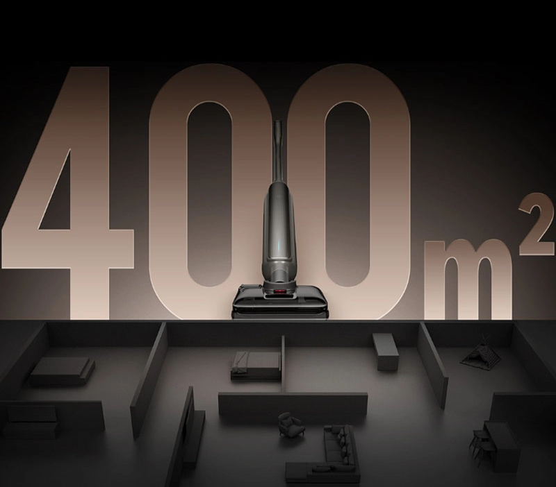 Аккумулятор на 5000 мА·ч обеспечивает до 50 минут уборки и покрывает до 400 м². Большие резервуары — 1000 мл для чистой воды и 700 мл для грязной — уменьшают частоту обслуживания. Устройство идеально подходит для больших помещений.
