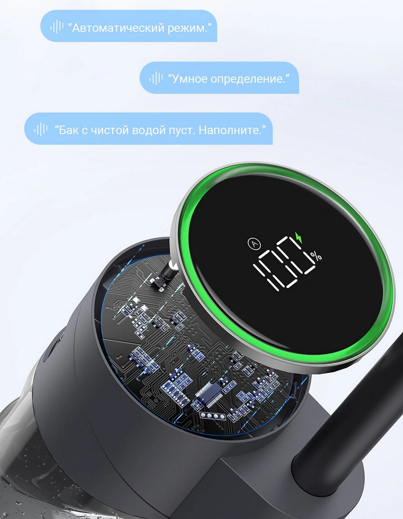 На дисплее отражается вся важная информация о состоянии пылесоса и процессе уборки. Помимо этого, предусмотрены и голосовые подсказки.