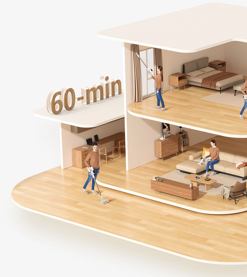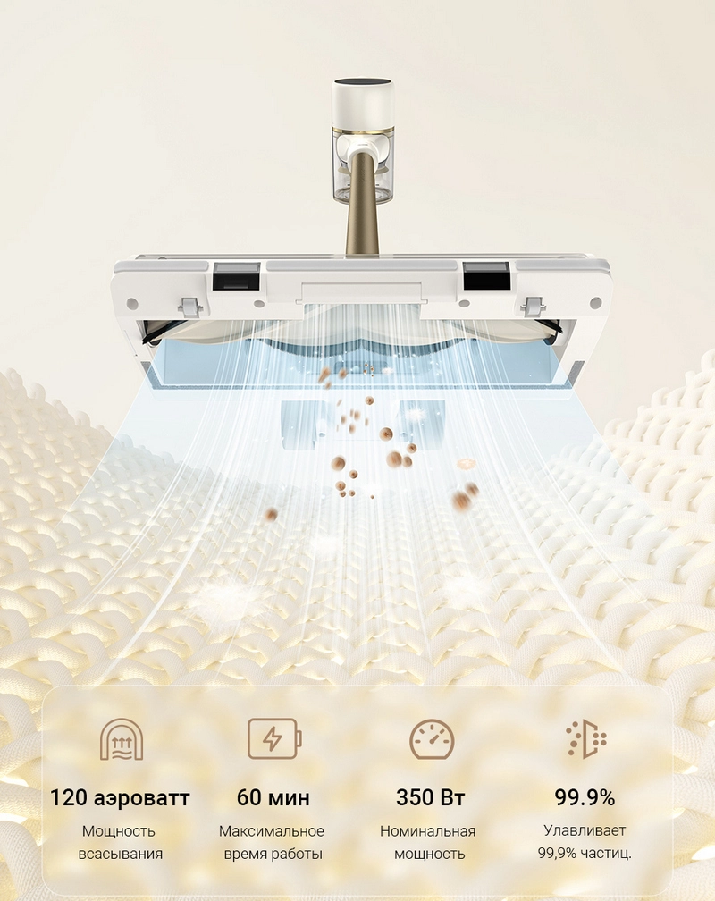Dreame R10 всасывает мусор с силой до 20 кПа и мощностью 120 аВт. В эко-режиме пылесос работает до 1 часа.