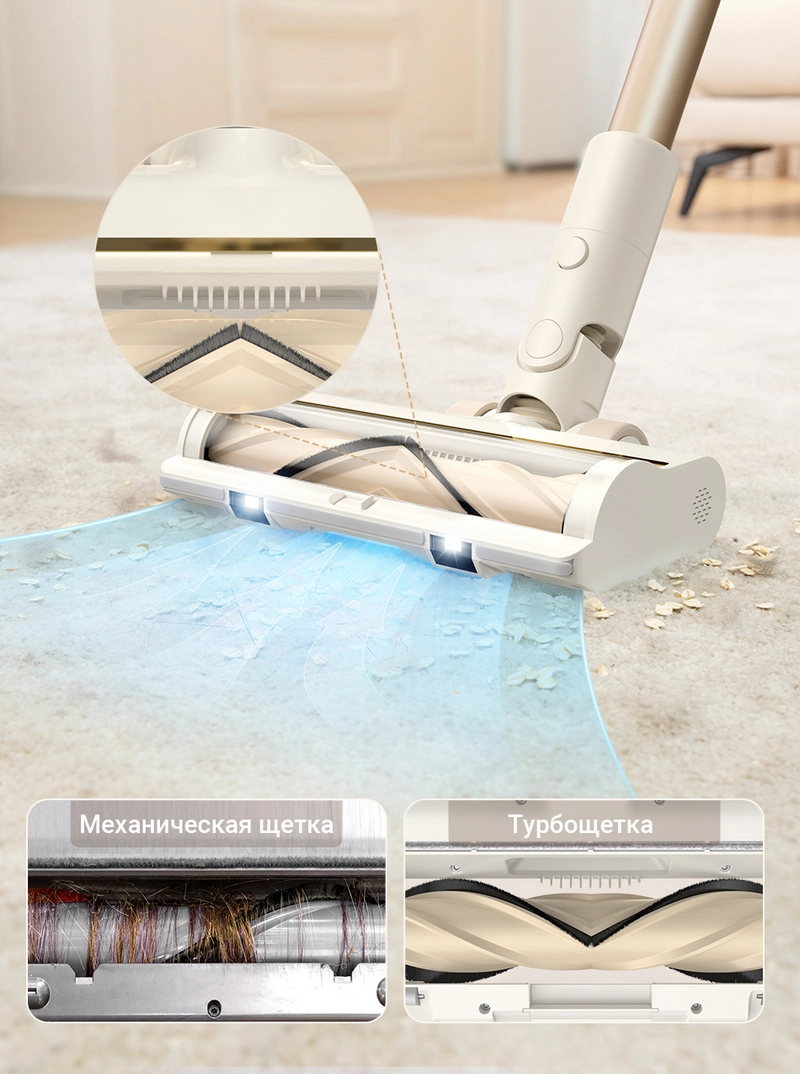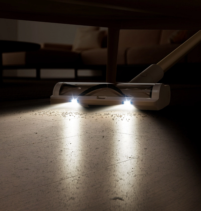 Основная щетка пылесоса яркой подсветкой для хорошего обзора в темных местах.