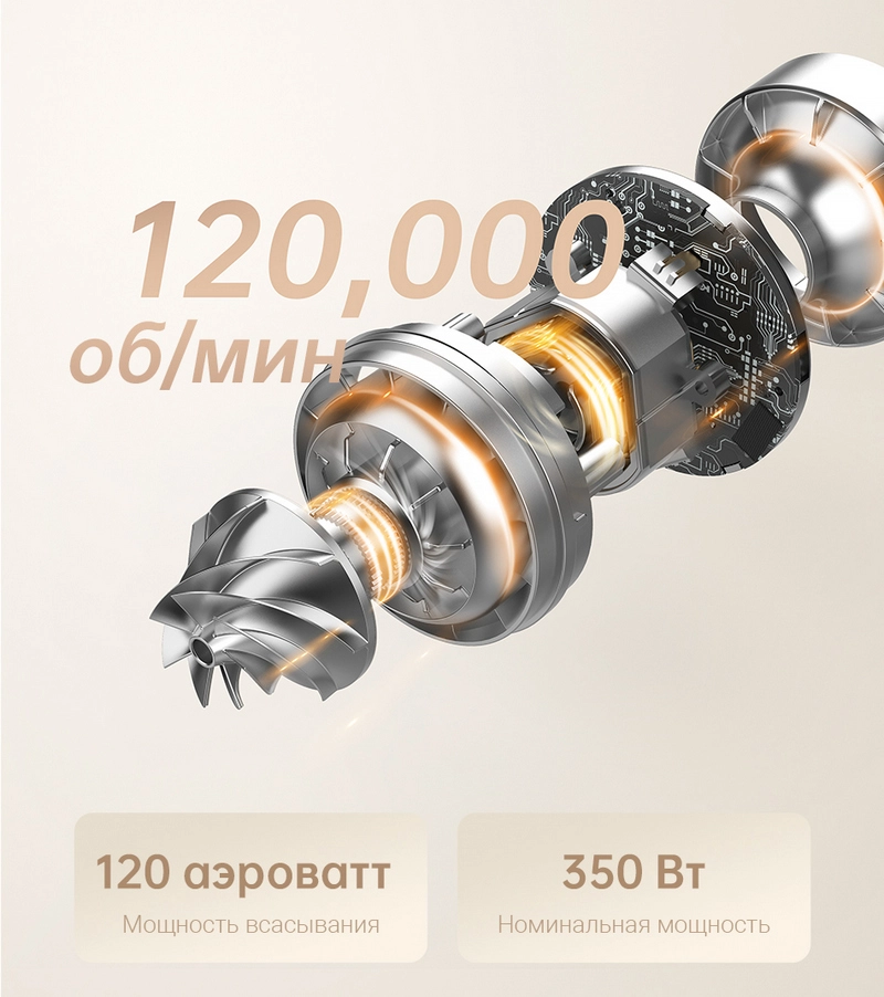 Бесщеточный двигатель Xiaomi Dreame R10 вращается со скоростью 120 000 оборотов в минуту и создает воздушный поток, который всасывает мусор с силой 120 аэроватт.