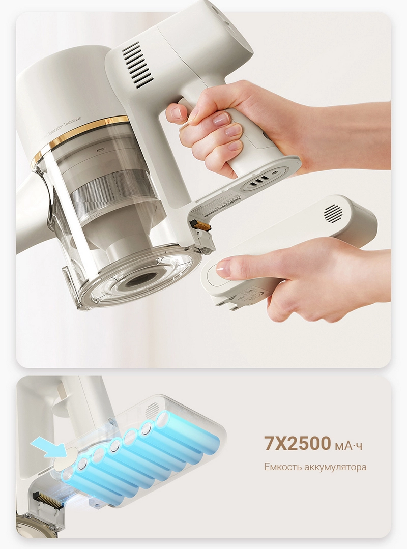 Аккумулятор Xiaomi Dreame R10 имеет съемную конструкцию и может быть заменен для увеличения времени уборки.