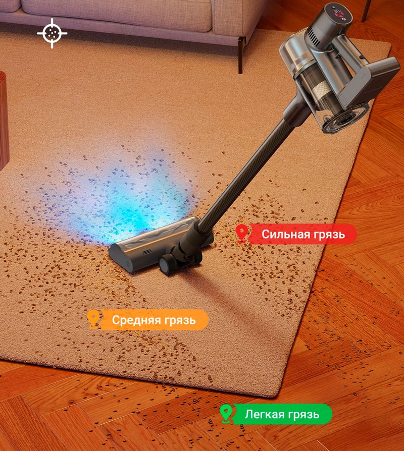 Интеллектуальные алгоритмы Dreame R20 распознают степень загрязнения напольного покрытия и автоматически подбирают оптимальную мощность всасывания. Это позволяет убирать максимально эффективно и оптимизировать расход заряда аккумулятора.