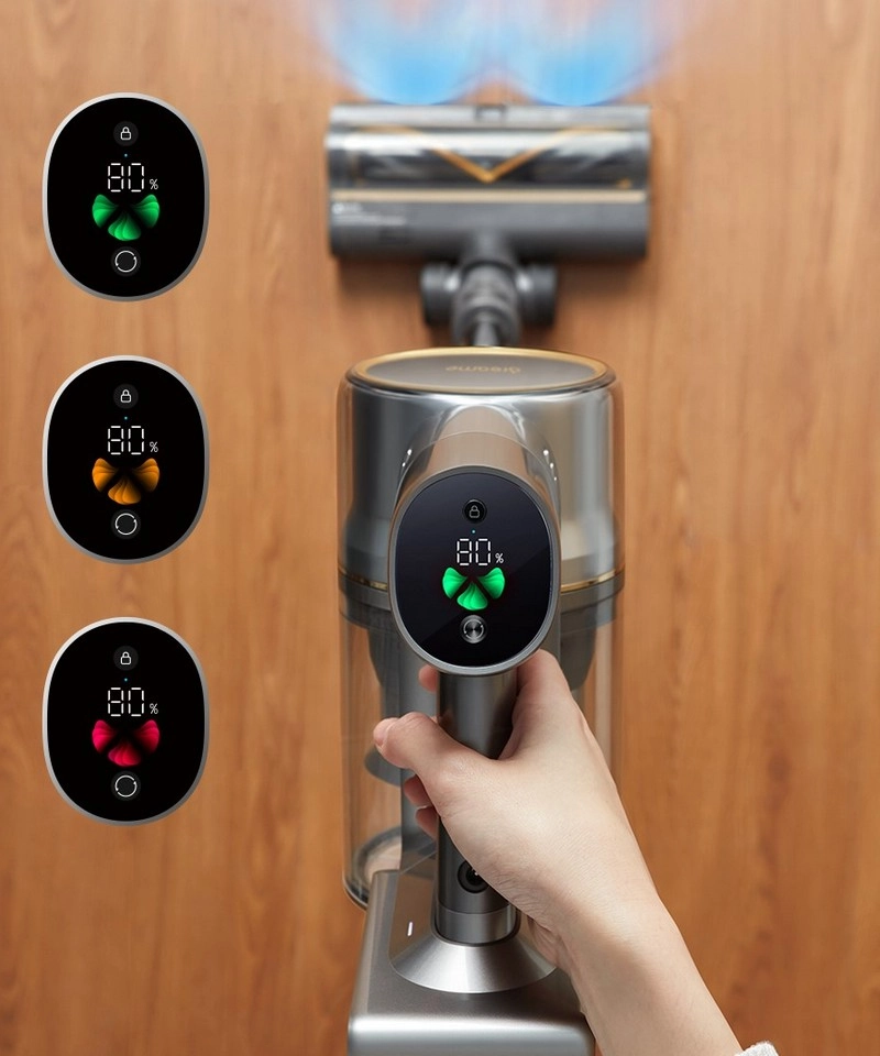 В торце пылесоса находится цветной экран, на котором отображается процент оставшегося заряда, выбранная мощность всасывания, режим блокировки.