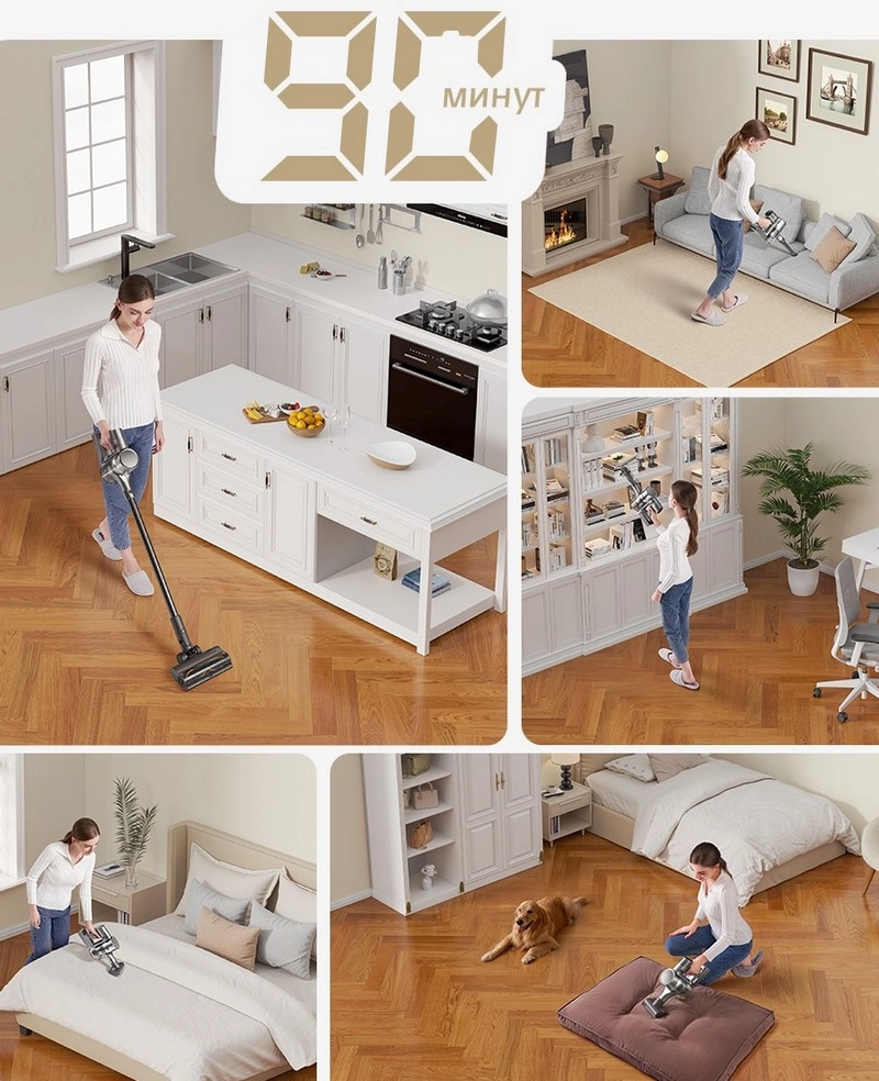 Красивый и удобный, взят в дополнение к роботу, так что сильно грязно у нас не бывает и всего хватает и бака, и зарядки. Кому не хватает можно докупить аккумулятор. Кстати, выбирала именно съемный, чтобы можно было поменять, когда потеряет мощность.