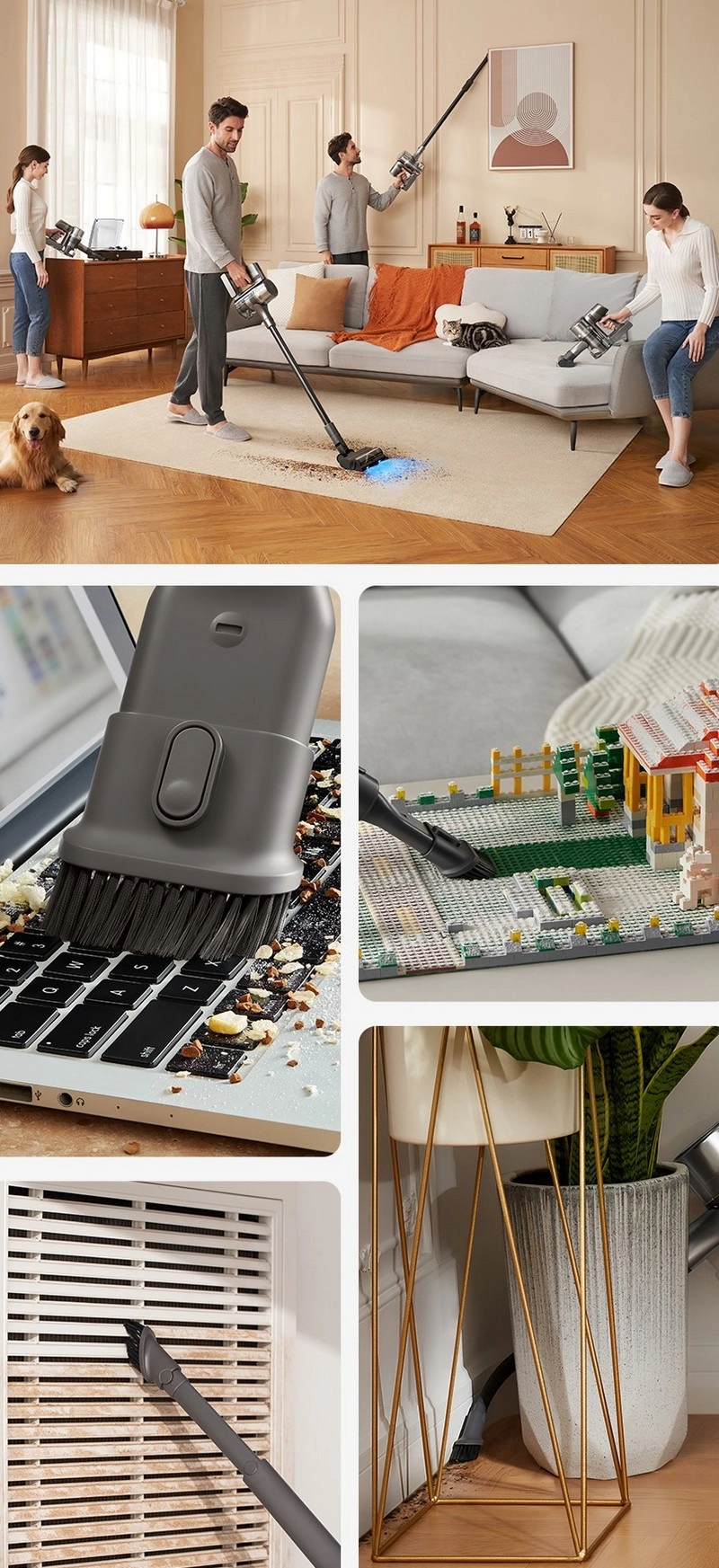 Невероятно мощный пылесос с синей подсветкой пыли и большим набором аксессуаров в комплекте.