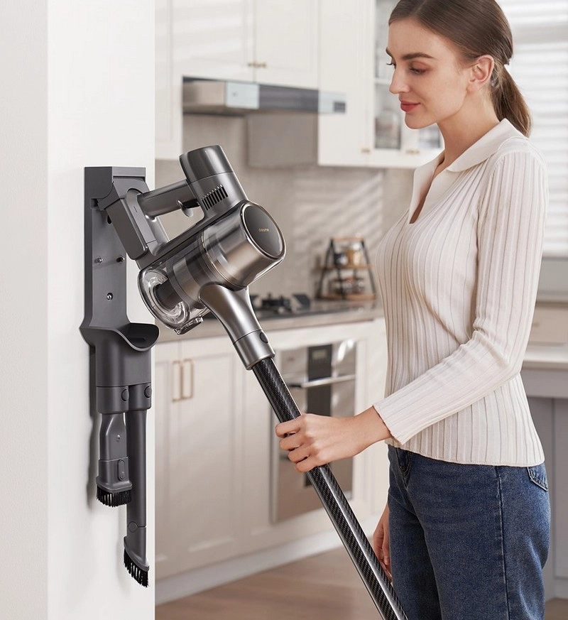 С помощью настенного фиксатора, пылесос и его аксессуары компактно хранятся в вертикальном виде.