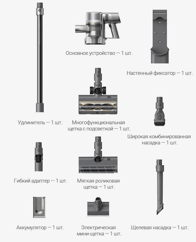 Комплектация Пылесос Dreame R20, удлинитель, настенный фиксатор, многофункциональная щетка с подсветкой, мягкая роликовая щетка, широкая комбинированная насадка, щелевая насадка, электрическая мини-щетка, гибкий адаптер, аккумулятор.