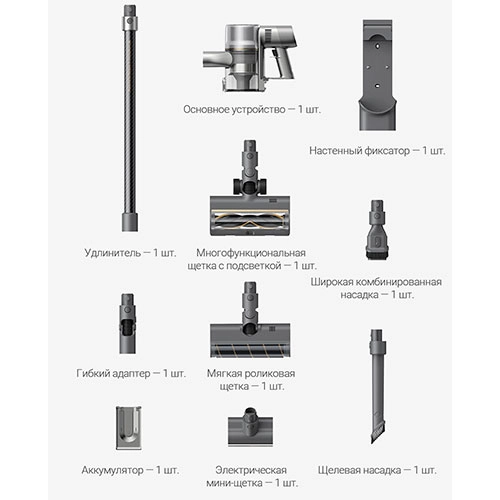 Комплектация Пылесос Dreame R20, удлинитель, настенный фиксатор, многофункциональная щетка с подсветкой, мягкая роликовая щетка, широкая комбинированная насадка, щелевая насадка, электрическая мини-щетка, гибкий адаптер, аккумулятор.