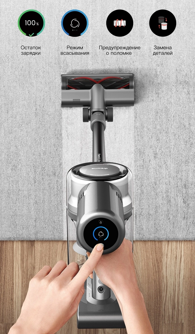На экран пылесоса выводится вся важная системная информация. Он показывает сколько осталось заряда у батареи, какой используется режим работы, сообщит о необходимости очистить фильтры и проинформирует о возможной неисправности.