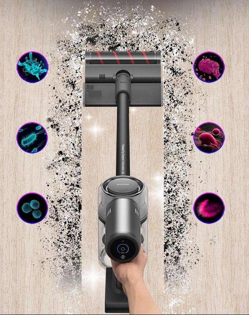 В Xiaomi Dreame V12 продумана каждая мелочь. Удобная вертикальная парковка совмещена с зарядной станцией, контейнер для пыли освобождается нажатием одной кнопки и не пачкает руки, все насадки легко подключаются, а фильтры можно мыть под проточной водой.