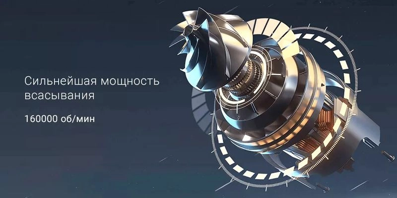 Самый мощный пылесос в линейке беспроводных пылесосов Xiaomi. 160 000 оборотов в минуту. 210 аэроватт и сила всасывания 32 000 Па.
