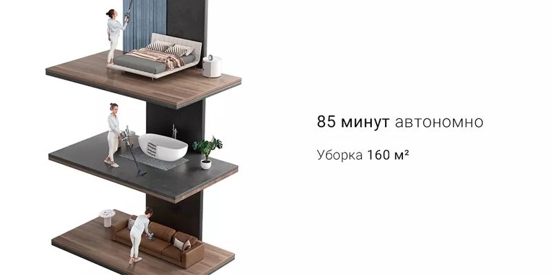 Полностью заряженный пылесос может работать до 85 минут подряд, очистив за это время 160 кв.м. площади.