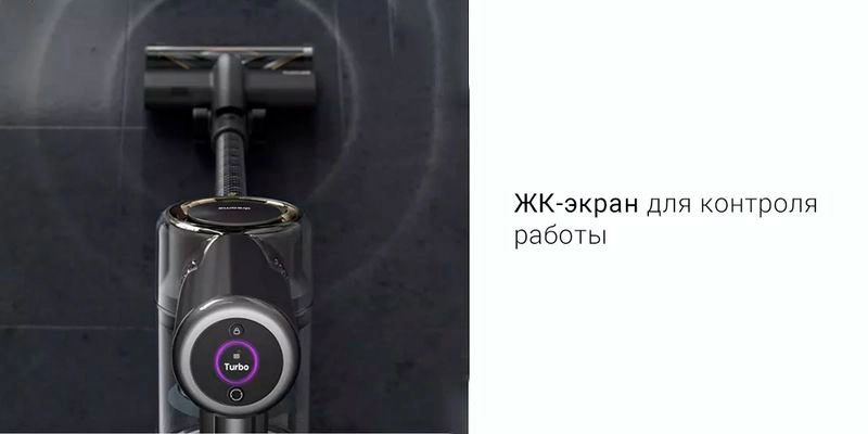ЖК-экран пылесоса показывает выбранный режим работы, оставшийся заряд аккумулятора и предупреждает о возможных ошибках в работе.