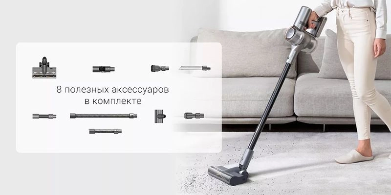 Комплектация 1. Основная турбо-щётка; 2. Антиклещевая насадка; 3. Универсальная щётка 2-в-1; 4. Насадка для мебели; 5. Щелевая насадка с LED-подсветкой; 6. Гибкий шланг; 7. Адаптер для труднодоступных мест; 8. Удлинительная труба из карбона; 9. Настенная док-станция; 10. Адаптер питания; 11. Руководство по эксплуатации.