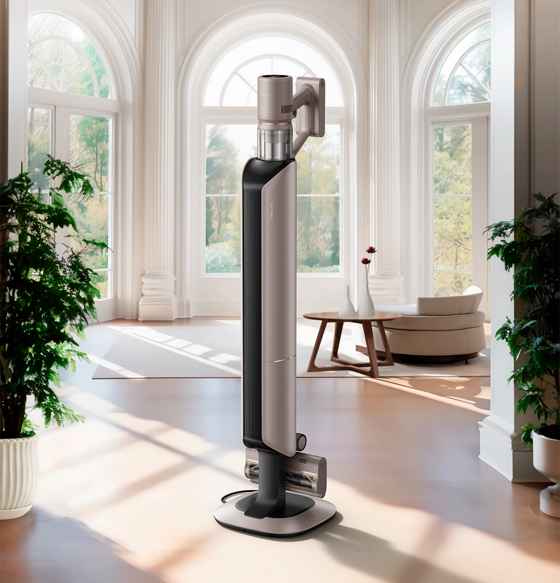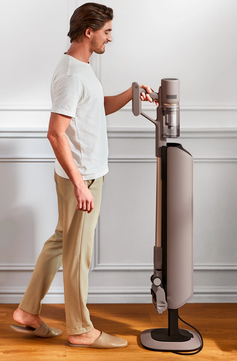 Док-станция с контейнером для пыли одновременно очищает пылесос, заряжает его и служит местом для хранения насадок.