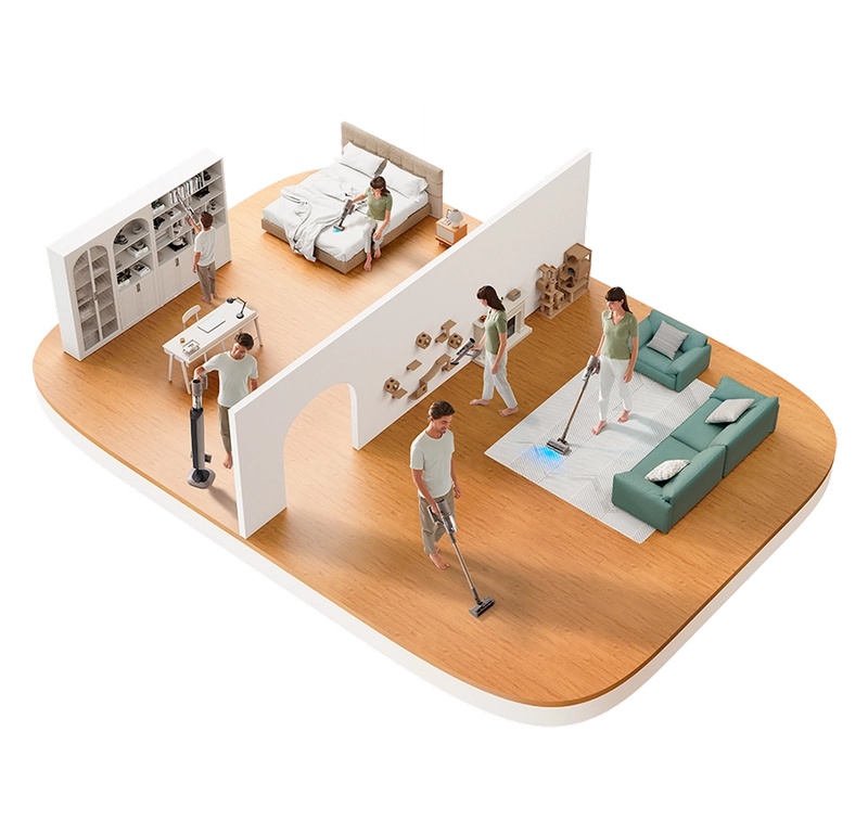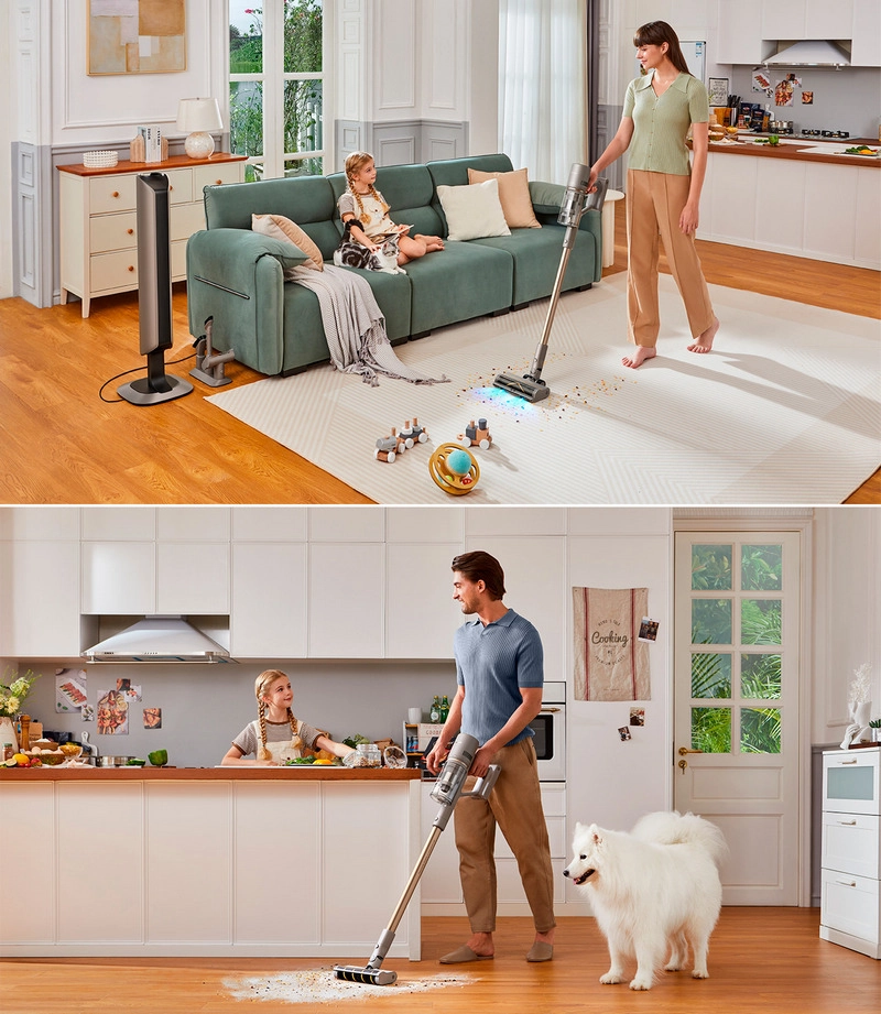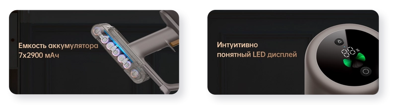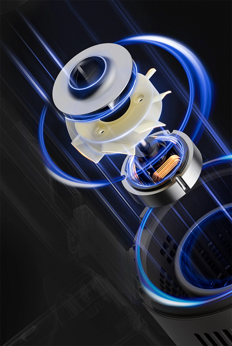 Пылесос работает с мощным бесщеточным двигателем, который вращается со скоростью 108 000 оборотов в минуту и формирует воздушный поток мощностью 150 аВт. Давление, создаваемое пылесосом, достигает 20 000 Па.