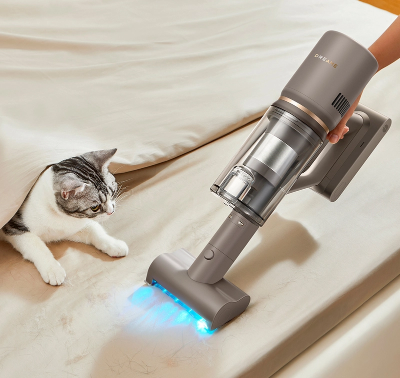 В комплекте насадок присутствует мини турбо-щетка с синей подсветкой. Она не только отлично собирает мусор и пылевых клещей с мягкой мебели, но и подсвечивает шерсть и перхоть от домашних животных.