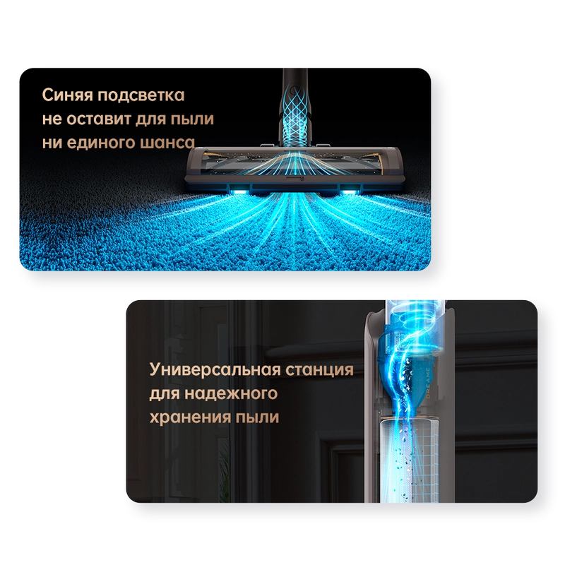 Пылесос с док-станцией самоочистки в комплекте. Большой набор насадок, мощность всасывания 20000 Па и светодиодная подсветка загрязнений.