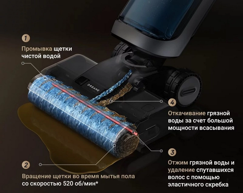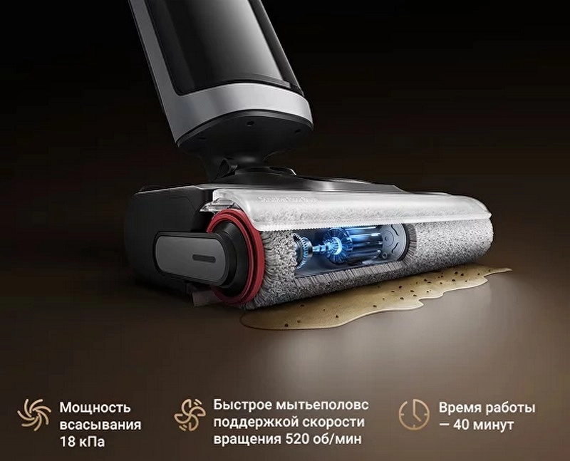 Мощность всасывания пылесоса 380 Вт, два ролика вращаются со скоростью 520 оборотов в минуту, а мусор и вода всасываются с давлением 18 кПа.