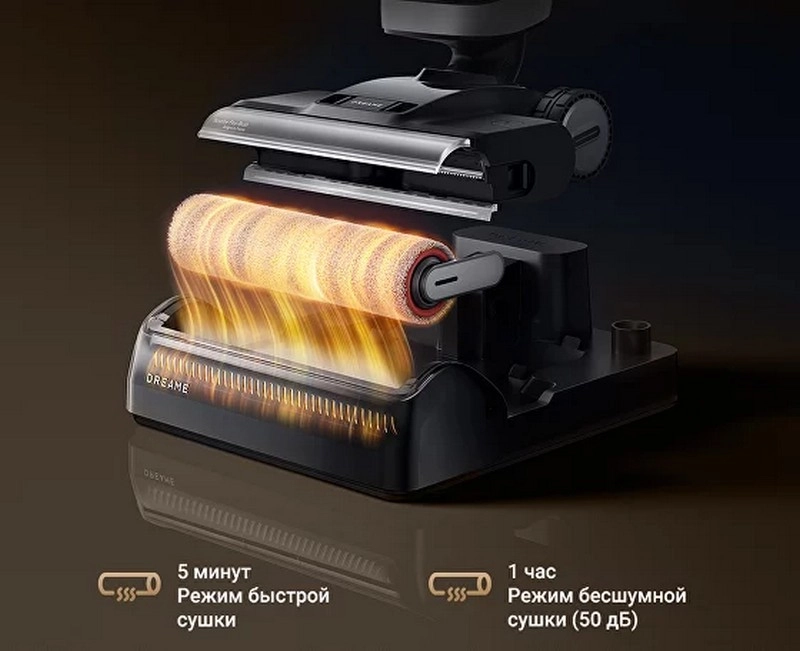 После очистки пылесоса влажные ролики сушатся горячим воздухом при температуре 60°С. Предусмотрено два режима сушки: быстрый за 5 минут и тихий за час.