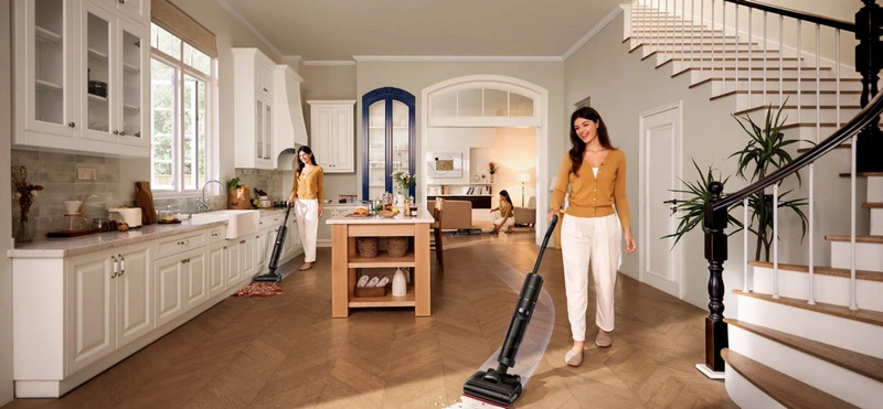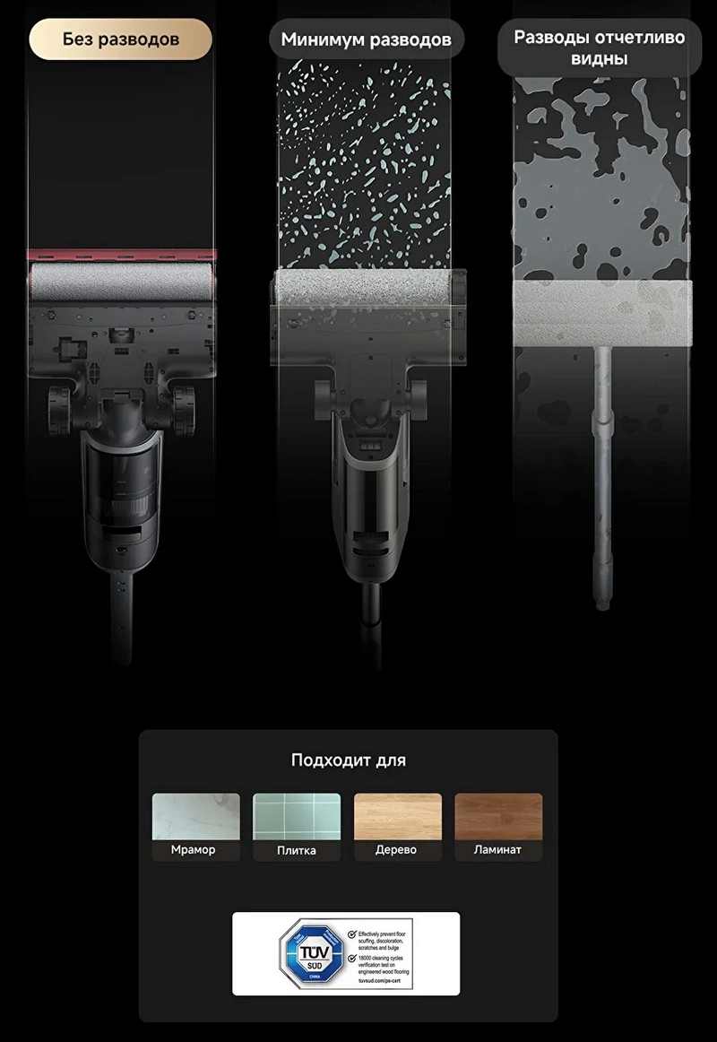 Прижимные скребки аккуратно собирают влагу, почти не оставляя следов. Такой подход защищает деревянные покрытия от влаги и гарантирует ровный, опрятный результат без дополнительной протирки.