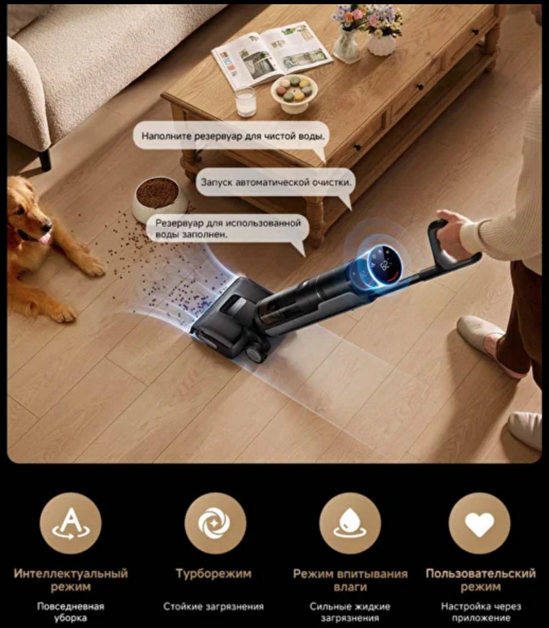 LED-дисплей и голосовые подсказки отображают ключевые параметры — от уровня заряда до активного режима. Пылесос сообщает о состоянии системы, помогая избежать ошибок и сосредоточиться на результате.