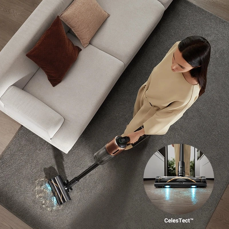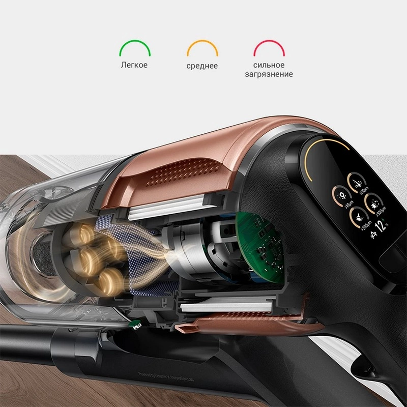 Интеллектуальная система обнаружения загрязнений анализирует воздушный поток и размер частиц для того, чтобы автоматически подбирать оптимальную мощность всасывания. За процессом уборки можно следить на LED-дисплее в торце пылесоса.