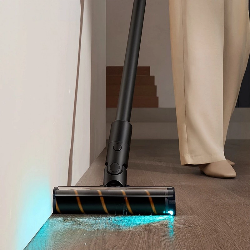 Щетка для гладкого пола со встроенной подсветкой позволяет убирать на расстоянии 7 мм от стены и не повреждает напольное покрытие.