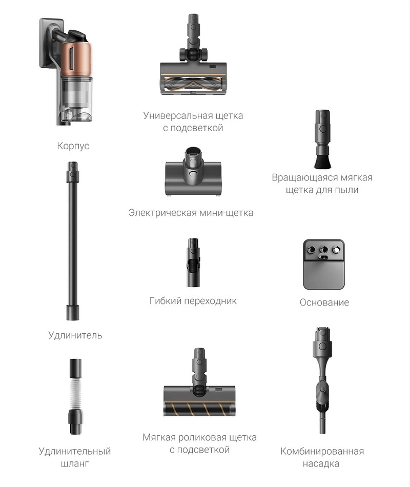 | Насадки в комплекте | Мягкая роликовая щетка с подсветкой, Универсальная щетка с подсветкой, Электрическая мини-щетка, Вращающаяся мягкая щетка для пыли, Комбинированная насадка | |