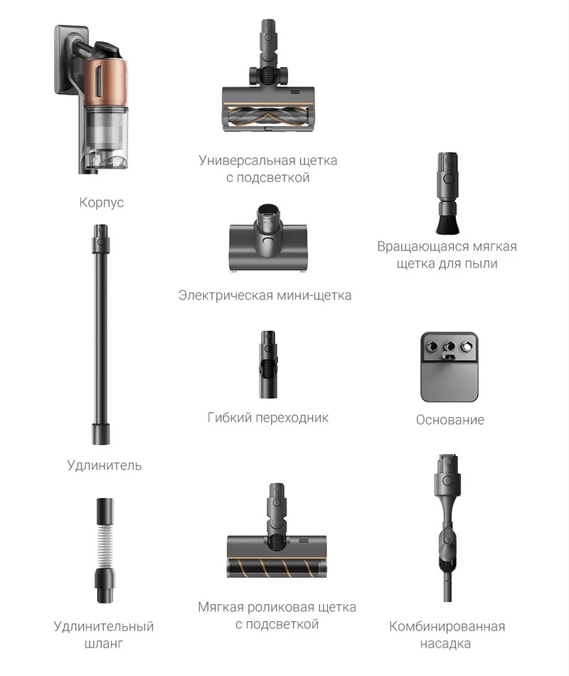 Мощный пылесос с подсветкой, большим набором насадок в комплекте и до 90 минут автономной работы.