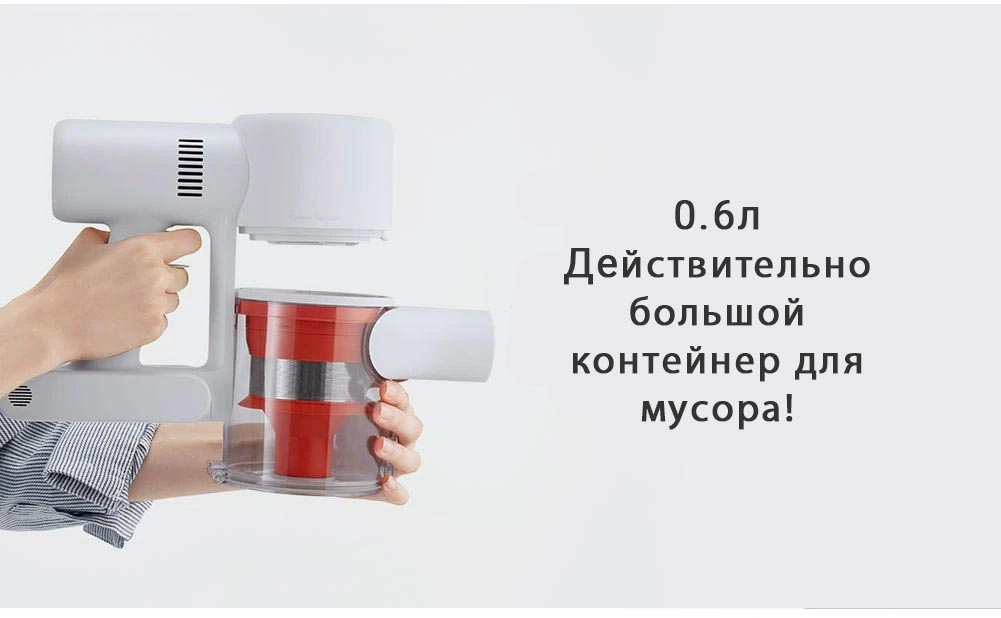 Объем пылесборника 600 мл. Этого вам хватит на полноценную уборку большой квартиры. Очистка контейнера происходит в 2 движения — нажать кнопку отсоединения и вытряхнуть содержимое.