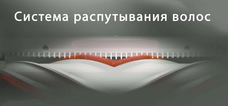 V-образная форма щетки и встроенная расческа препятствуют намотке шерсти и волос на валик.