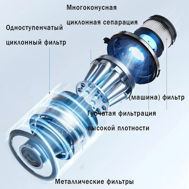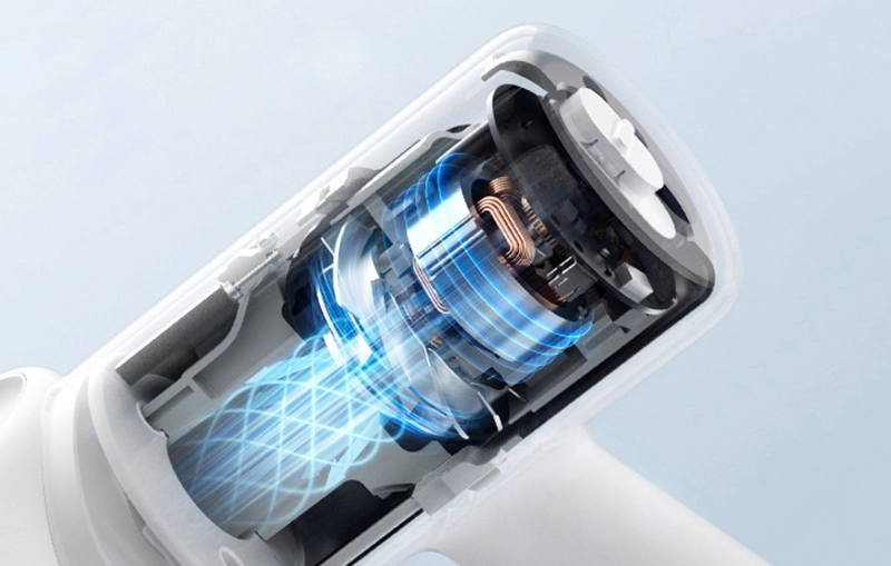 Бесщеточный двигатель вращается со скоростью 100 000 оборотов в минуту и поддерживает стабильную мощность всасывания до 20000 Па.