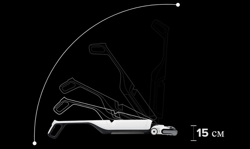 Пылесос оснащен технологией FlatReach, которая позволяет ему полностью раскладываться и тщательно убирать под мебелью высотой выше 15 см.
