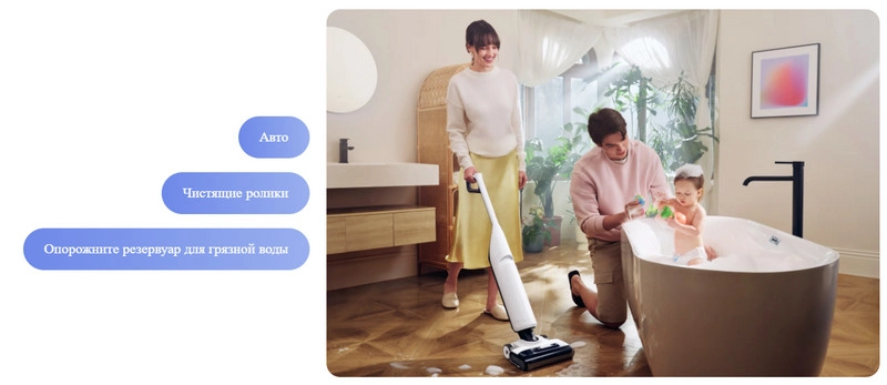 | Особенности | Голосовое оповещение ,Режим сушки пола , Самоочистка роликовой щетки , сушка горячим воздухом | |