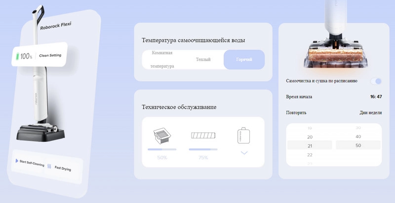 В приложении можно выбирать подходящий режим очистки, следить за состоянием расходников и настроить очистку и сушку пылесоса по расписанию.