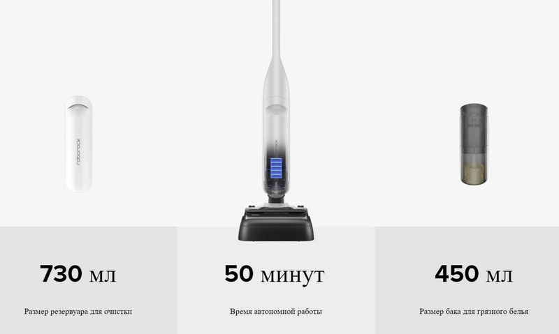Встроенного аккумулятора хватает на 50 минут непрерывной уборки. Пылесос оснащен резервуаром для чистой воды объемом 730 мл и баком для грязной воды объемом 450 мл.