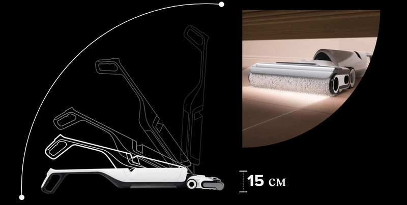 Пылесос оснащен технологией FlatReach, которая позволяет ему полностью раскладываться и тщательно убирать под мебелью высотой выше 15 см.