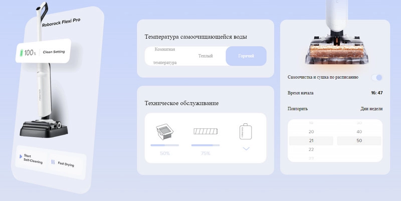 В приложении можно выбирать подходящий режим очистки, следить за состоянием расходников и настроить очистку и сушку пылесоса по расписанию.